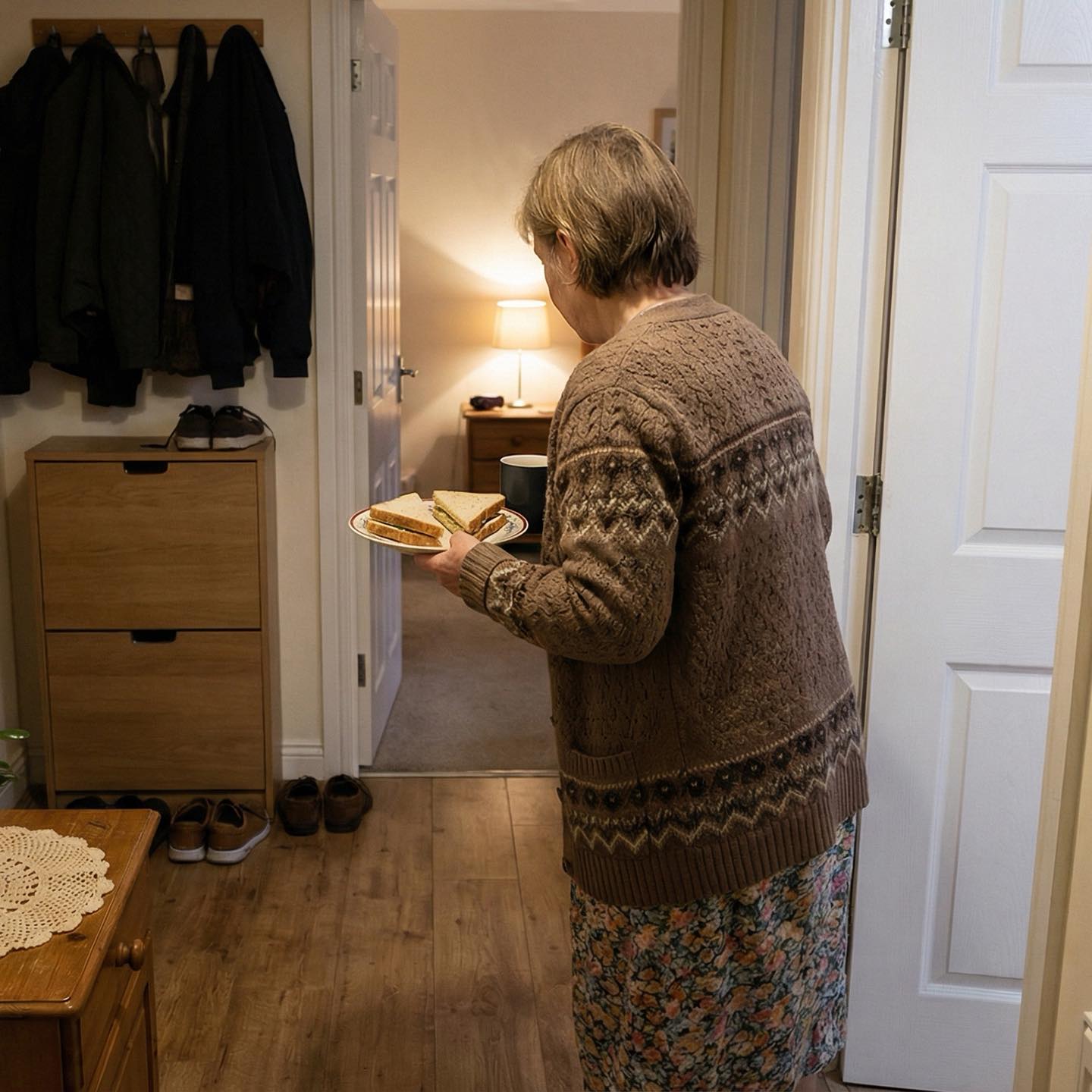 Je ne suis pas entrée. J'ai posé mon assiette sur la commode de l'entrée, silencieusement, comme si je volais dans mon propre appartement. Du chocolat chaud s'est renversé sur la serviette, celle que ma mère avait crochetée. Je ne l'ai pas essuyée. Je suis retournée à la cuisine et me suis assise à table, les genoux tremblants comme après une heure passée sur un tapis roulant.