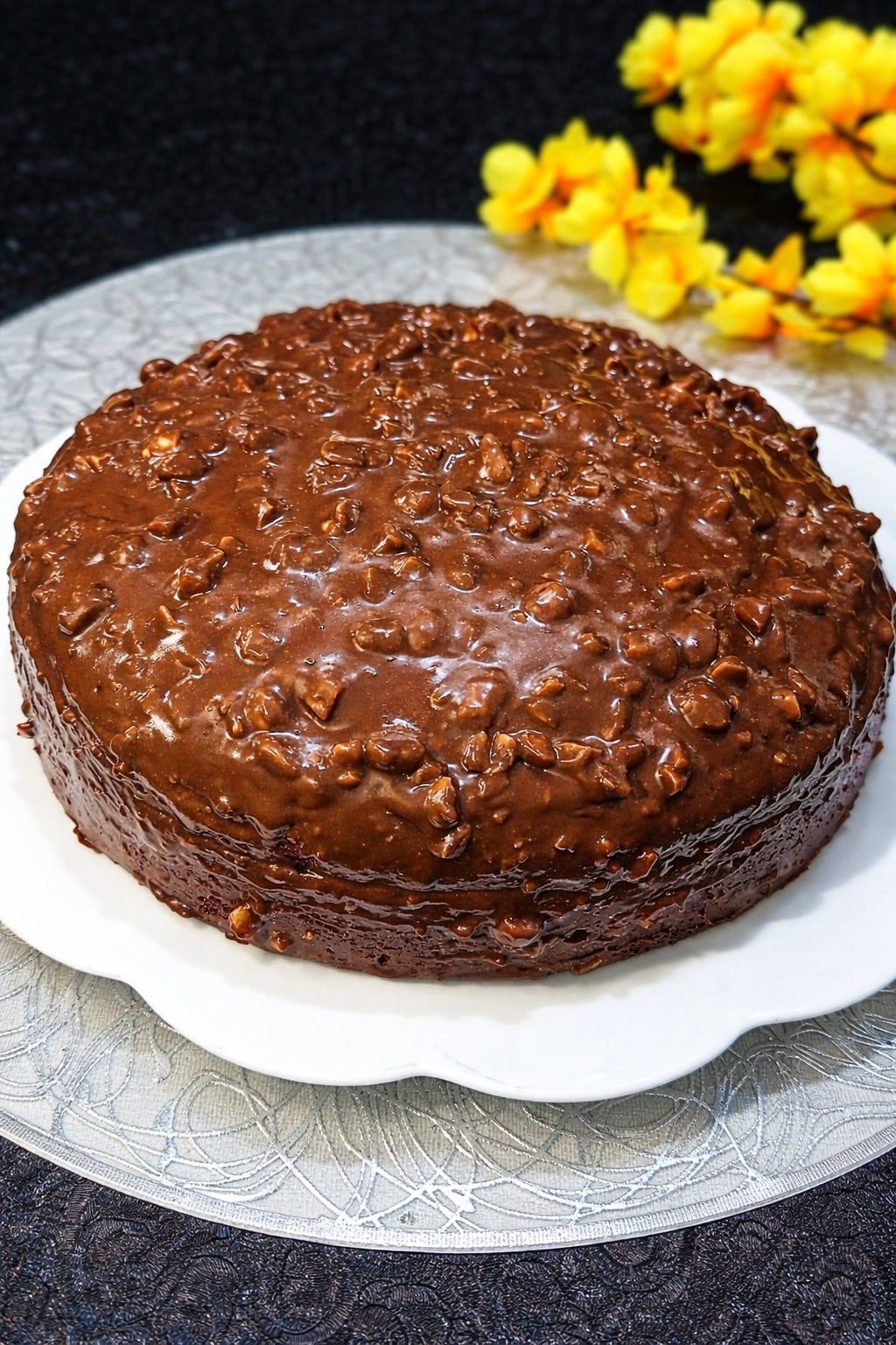 Le gâteau au chocolat est un grand classique qui traverse les générations. Mais lorsqu’il est nappé d’un glaçage croquant aux noix, il se transforme en un dessert encore plus gourmand, à la fois fondant et croustillant. L’image illustre parfaitement cette alliance : un gâteau au chocolat moelleux, recouvert d’un glaçage brillant et généreusement parsemé de noix concassées.